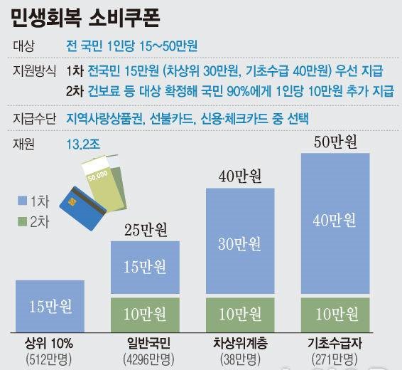 - 전 국민 기본 15만 원 지급, 저소득층은 최대 50만 원까지